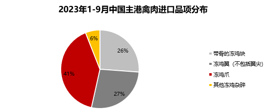 2023 9 月中國主港禽肉進口量 9.44 萬噸,環(huán)比減少 10%,同比減少6%。1-9月,中 國主港禽肉進口量101.48萬噸,同比增加 26%。從進口國別看,進口巴西禽肉共計 52.57萬 噸,同比增加 69%,占比 52%。進口美國禽肉 19.63萬噸,同比減少 4%,占比 19%。進口 俄羅斯禽肉 9.86萬噸,同比增加1%,占比 10%。進口泰國禽肉 8.55 萬噸,同比增加46%,占比 8%。從進口品項看,帶骨凍雞塊進口量26.56萬噸,占比 26%。凍雞翼(不包括翼尖) 27.75 萬噸,占比 27%。凍雞爪進口量41.10萬噸,占比 41%。其他凍雞雜碎進口量 6.09 萬噸,占比 6%。從進口金額看,1-9月,中國主港肉進口金額共計 32.81億美金,同比增 加 17%。其中,巴西禽肉進口金額 15.16億美金,同比增加57%。美國禽肉進口金額 6.36 億美金,同比下滑 30%。泰國禽肉進口金額3.85億美元,同比增加 47%。俄羅斯禽肉進口金額 3.41億美金,同比增加23%。白俄羅斯禽肉進口金額 2.45 億美金,同比增77%。