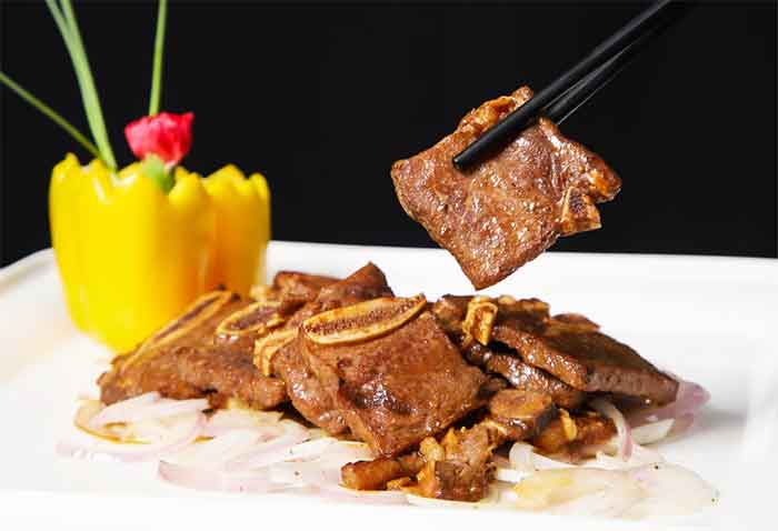 牛仔骨重要的附加價(jià)值就在于“帶骨”“有骨氣”,帶骨煎制或烤制,肉香更為濃郁,加上我們是喜歡啃硬骨頭的。比如“帶骨牛小排Karubi”烤肉,這款烤肉需要肉與骨一起切,可在其冷凍狀態(tài)時(shí)鋸成想要的厚度。韓式烤肉中就常有帶骨Karubi,一般將牛仔骨的三支骨頭沿垂直方向切成骨長(zhǎng)約4厘米,大小片切時(shí)約8厘米的平板狀。切成扁平狀時(shí),為使頭尾的切口處平整,需把肉切薄,去除肉片表面附著的殘骨。注意不要將附著在骨頭周圍的霜降大理石紋精肉與骨頭分離,小心地沿著肉骨交接處劃下約5毫米深的刀痕,可使醬料沿著刀痕充分滲入整塊肉,這是韓式烤肉的美味秘訣。在宴會(huì)菜單或什錦拼盤中加入牛仔骨,會(huì)令人覺(jué)得十分豪華。特別是長(zhǎng)8厘米的大片牛仔骨占滿整個(gè)烤肉網(wǎng)的擺法,不禁令人贊嘆,價(jià)值感滿滿。