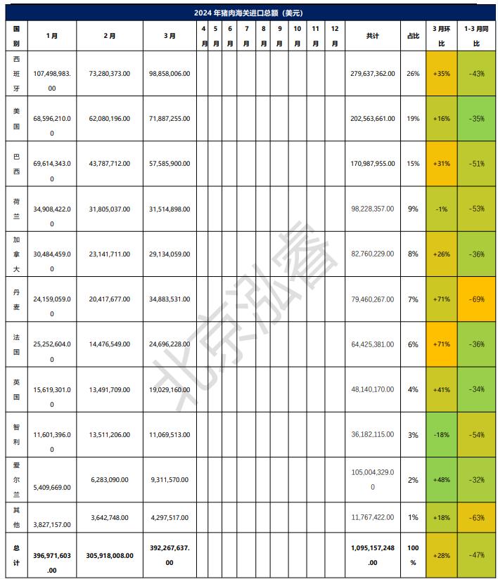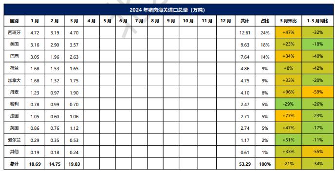 2024年1-3月冷凍豬肉進口概況