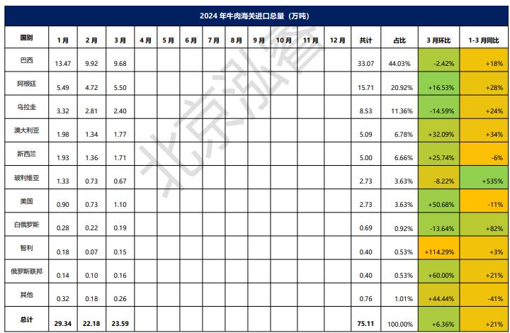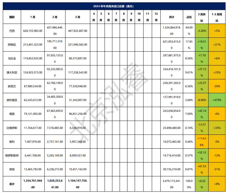 2024年1-3月冷凍牛肉進口概況