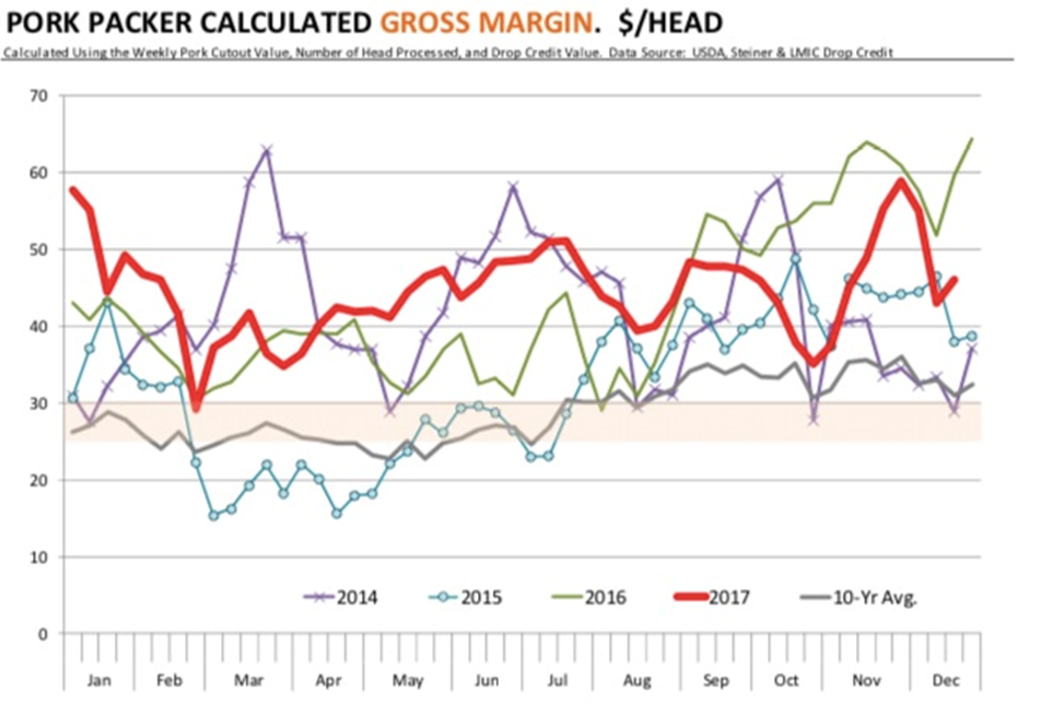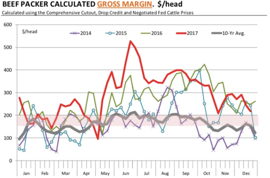 下附兩張圖表描繪了貿(mào)易商在開年的利潤(rùn)率的不同情況。牛肉貿(mào)易商的利潤(rùn)率在很大程度上被壓縮到今年年初,部分原因是寒冷的天氣對(duì)牛群的影響。在2017年,牛肉貿(mào)易商的利潤(rùn)率非常好,對(duì)2018年的利潤(rùn)率也仍然保持十分穩(wěn)健的預(yù)期。但是通常一季度的利潤(rùn)都很低,今年也不會(huì)是個(gè)例外。當(dāng)所有牛肉需求呈良好態(tài)勢(shì),牛供應(yīng)將持續(xù)增加,也會(huì)驅(qū)動(dòng)對(duì)牛肉分銷服務(wù)的需求。在最近兩周牛肉貿(mào)易商的利潤(rùn)率被擠壓,我們認(rèn)為2017的最后一周的利潤(rùn)率非常接近于盈虧平衡點(diǎn)。如果精選級(jí)牛部位肉價(jià)格保持在205美元這個(gè)范圍,貿(mào)易商會(huì)支付120美元去買牛,剩下的也就接近盈虧平衡,而沒有賺到一點(diǎn)錢。生豬貿(mào)易商在開年的利潤(rùn)率通常都很高。假期縮短的周數(shù)往往使生豬利潤(rùn)率延遲,在開年會(huì)有一個(gè)很大的需求,而這個(gè)需求伴隨著市場(chǎng)積壓庫存的清空。寒冷的天氣并沒有對(duì)生豬造成多大損失, 因?yàn)槎急灰浦糜谑覂?nèi)喂養(yǎng),牛的情況也是如此。在產(chǎn)品方面,貿(mào)易商也非常頭疼節(jié)后后腿需求的暴跌。在這種情況下,生產(chǎn)商會(huì)為了保持生豬的流通運(yùn)轉(zhuǎn)而提供給貿(mào)易商一個(gè)足夠大的利潤(rùn)空間。這個(gè)庫存積壓的問題往往能被相當(dāng)快的解決。在1月的下半月我們應(yīng)該會(huì)看到一個(gè)更加正常的市場(chǎng)狀態(tài)。接下來的挑戰(zhàn)是豬肉在國(guó)內(nèi)和國(guó)外渠道中的需求。期貨市場(chǎng)現(xiàn)在的價(jià)格走勢(shì)呈現(xiàn)出了在這個(gè)冬季和早春對(duì)豬肉的積極需求。去年我們看到了對(duì)豬部位肉和生豬需求的顯著激增,此趨勢(shì)一直持續(xù)到2月。這也很大程度上歸功于豬五花的高位價(jià)格。后腿價(jià)格最近持續(xù)疲軟,我們正看到更多的產(chǎn)品在現(xiàn)貨市場(chǎng)交易。和墨西哥的貿(mào)易持續(xù)穩(wěn)定,現(xiàn)在較低的后腿價(jià)格應(yīng)該能持續(xù)助力外銷。今年冬天期間生豬疾病的壓力是一個(gè)問題,一些報(bào)告顯示,豬藍(lán)耳病和豬流行性腹瀉病病例在增加。但情況與我們過去兩年看到的情況類似,目前尚未有太多影響。