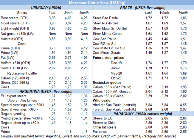 南方共同市場(chǎng)閹牛價(jià)格再次下跌3美分,胴體價(jià)格下降至3.07美元/公斤,四周以來連續(xù)下跌16美分。盡管巴西上周育成牛價(jià)格保持穩(wěn)定趨勢(shì),在主要的出口州凈差額再次下跌2雷亞爾,下跌至184.5雷亞爾/15公斤。按美元算價(jià)格下跌4美分下跌至3.02美元/公斤。烏拉圭閹牛價(jià)格也在下跌,參考價(jià)格自9月上半月15周以來首次跌破4美元/公斤。巴拉圭和阿根廷參考價(jià)格的變化很小,巴拉圭育成牛胴體價(jià)格連續(xù)第五周保持2.8美元/公斤,阿根廷參考價(jià)下跌2美分,下跌至2.78美元/公斤。