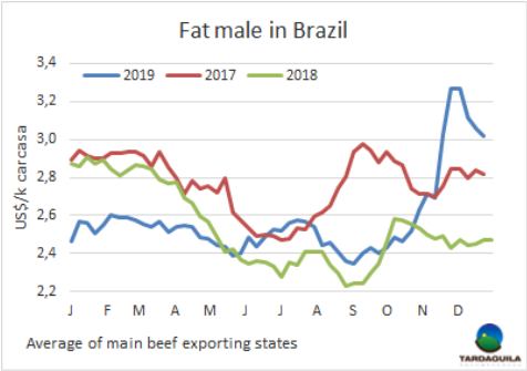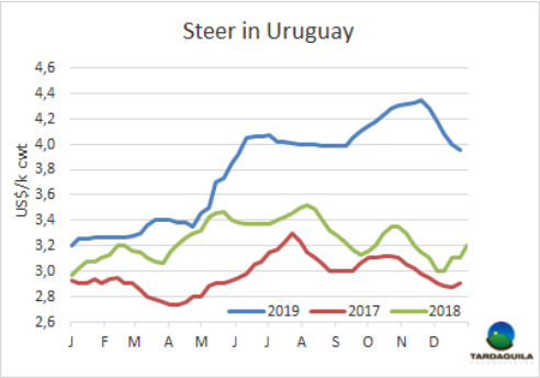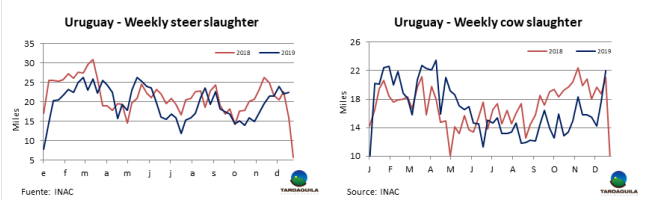 烏拉圭工廠也關(guān)注到中國市場(chǎng)的下行。巴西現(xiàn)在開始將部分出口供應(yīng)轉(zhuǎn)向巴拉圭的關(guān)鍵市場(chǎng),如智利和俄羅斯。智利圣地亞哥1月裝船的巴拉圭全牛20件套5300美元/噸,俄羅斯市場(chǎng)肩胛背肩上周從4100美元/噸下降到3800每元/噸。據(jù)一位業(yè)內(nèi)人士稱,后部位肉巴拉圭工廠售價(jià)不超過4300美元/噸,“競(jìng)爭(zhēng)不容易,現(xiàn)在我們還要與活牛價(jià)格走低的巴西競(jìng)爭(zhēng)。”