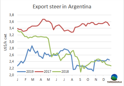 盡管費(fèi)爾南德斯政府加征出口稅整體上沒有帶來明確的影響,但是已經(jīng)表露出一些跡象。目前,實(shí)際出口稅率的增長(zhǎng)幾乎翻了一番,因?yàn)榘幢人骼U納實(shí)際出口稅相當(dāng)于4.8%的稅率,而通過法令廢除按比索繳納的出口稅后,實(shí)際匯率上升到9%。最后經(jīng)濟(jì)緊急狀態(tài)法將授權(quán)將出口稅提高到15%,暫未頒布。然而,據(jù)分析,盡管經(jīng)濟(jì)因素為肉類行業(yè)帶來擔(dān)憂,但目前最緊急的是中國市場(chǎng)的情況。據(jù)畜牧專家稱,“出口稅總歸是不好的,它們產(chǎn)生了一定影響,但現(xiàn)在最大的問題是中國市場(chǎng)的下行和合同的議價(jià),這比出口稅更復(fù)雜。我們要今天的批準(zhǔn)結(jié)束后看看一切結(jié)果如何,然計(jì)算損失?!?span>Cofrigo總經(jīng)理表示目前中國市場(chǎng)情況是影響最大的,因?yàn)?span>11