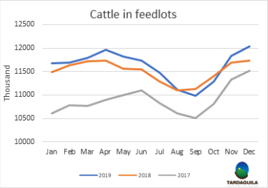 2019年12月1日,美國屠宰市場(chǎng)存欄能力1000頭及以上的飼育場(chǎng)牛只存欄總計(jì)約1200萬頭,比2018年12月1日增長(zhǎng)2%。11月補(bǔ)欄209萬頭,比2018年增長(zhǎng)5%,凈增203萬頭。11月出欄總量181萬頭,比2018年減少3%,11月掉頭數(shù)量6.5萬頭,比2018年減少了19%。