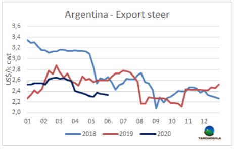 盡管希爾頓產(chǎn)品價(jià)格上漲,中國(guó)部位肉價(jià)格下跌,上周出口閹牛和出口母牛價(jià)格穩(wěn)定,最好的英國(guó)純種閹牛保持155-160比索/公斤,印度串種閹牛保持150-155比索/公斤,特優(yōu)種母牛138-142比索/公斤,工業(yè)母牛報(bào)價(jià)120-130比索/公斤。