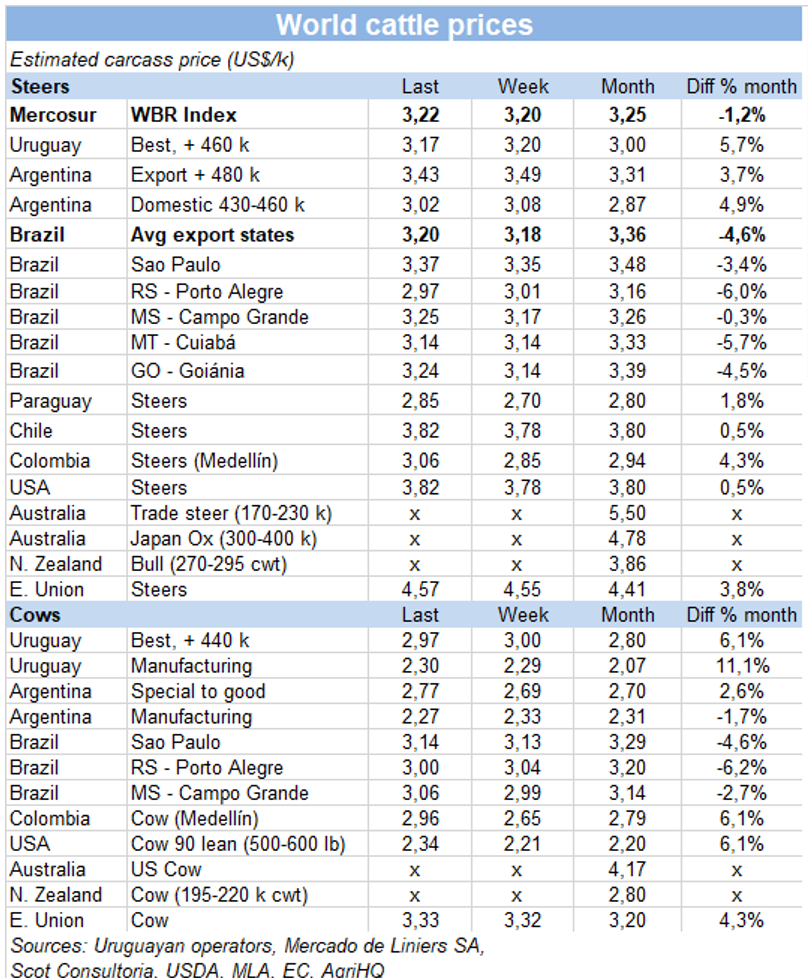 本周南方共同市場閹牛價(jià)格指數(shù)上漲了2美分上漲至3.22美元/公斤,主要受巴西和巴拉圭活牛價(jià)格上漲的影響。巴西方面活牛價(jià)格上漲了5.4雷亞爾/15公斤,上漲了2.2%,被1.4%的雷亞爾貶值部分抵消,美元牛價(jià)上漲了2美分至3.2美元/公斤。巴拉圭方面近幾周牛價(jià)維持在較低水平,本周牛價(jià)開始強(qiáng)勢上漲,由于臨近口蹄疫疫苗接種期,且降水充足,待宰公牛上漲了15美分,至2.85美元/公斤。烏拉圭和阿根廷活牛價(jià)格走勢相反,烏拉圭市場供應(yīng)飽和,阿根廷方面幾周以來牛價(jià)上漲了30%后保持穩(wěn)定。