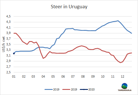 今年前幾天,盡管供應(yīng)不足,但需求飽和,價(jià)格較上周下降了幾美分。畜牧生產(chǎn)最大的擔(dān)憂就是缺乏降水,烏拉圭一半以上的地區(qū)都宣布進(jìn)入農(nóng)業(yè)緊急狀態(tài),希望都寄托在周三的天氣預(yù)報(bào)上,天氣預(yù)報(bào)宣布將有不同強(qiáng)度的降雨和風(fēng)暴,雖然不均勻,但范圍廣泛。大部分活牛預(yù)定期限達(dá)15-20天,一些工廠為月末的生產(chǎn)預(yù)定了活牛。目前市場價(jià)格參差不齊,一些工廠甚至不給還價(jià),另外有工廠還價(jià)低于上周價(jià)格5美分。由于成交極少,很難建立價(jià)格參考。未來市場走勢還將取決于降雨情況,目前降雨已開始蔓延到烏拉圭南部。