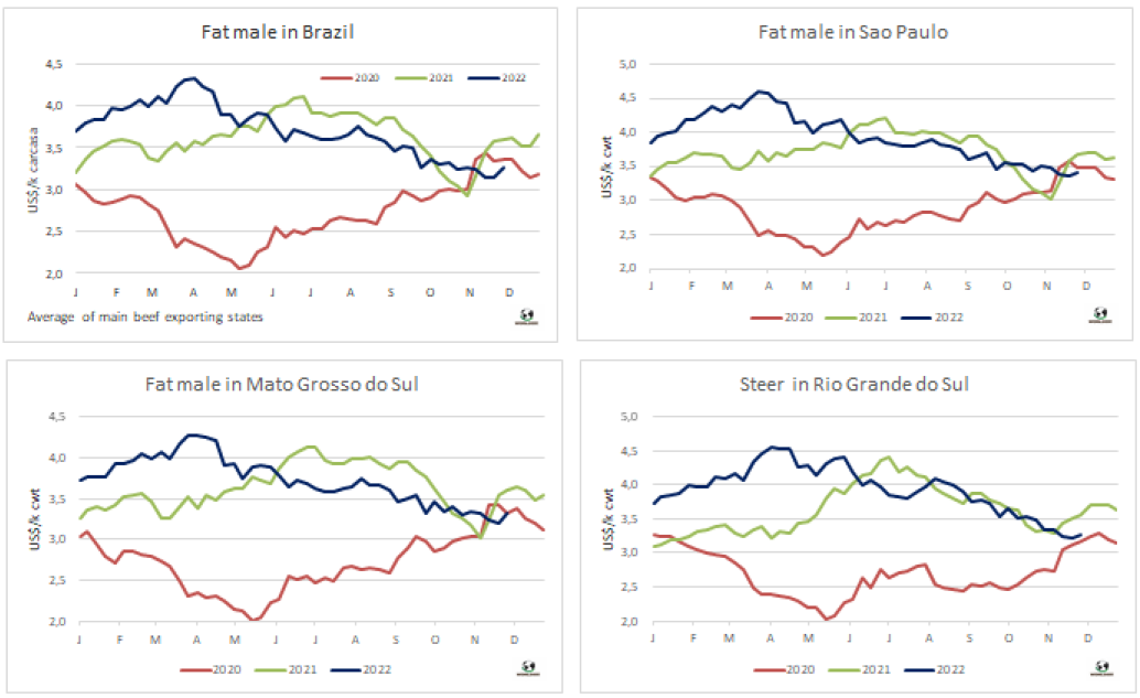 Agrifatto咨詢公司的畜牧經(jīng)理預測,隨著公牛和母牛屠宰量的同步增加,牛肉價格應該在年末幾周下降。在馬托格羅索的一次采訪中,他說,在消費較低的時候,市場上肉類供應增加,這應該會轉化為終端消費下個的下降。農民已經(jīng)感受到了價格的下降,與去年同期相比,育肥牛價格下降了11%,但消費者還沒有感受到。Agrifatto預測,隨著國內市場的供應進一步增加,牛肉價格的下跌將持續(xù)到2023年。