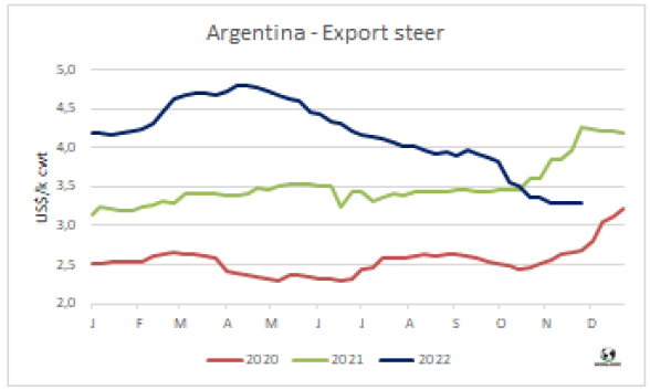 南方共同市場閹牛價格指數(shù)離開過去五周的窄幅波動區(qū)間,本周該指數(shù)上漲了6美分,至3.37美元/公斤,主要受巴西牛價上漲的拉動。巴西主要出口州育肥牛價格上漲11美分至3.25美元/公斤,主要因為雷亞爾價格上漲,以及匯率升值1.5%。巴拉圭方面,價格也有上漲,待宰閹牛價格上漲了10美分至3.3美元/公斤。阿根廷方面,出口閹牛比索價格上漲匯率下降導致美元價格下跌2美分至3.58美元/公斤。烏拉圭連續(xù)四周的上漲趨勢停止,本周牛價保持3.6美元/公斤。