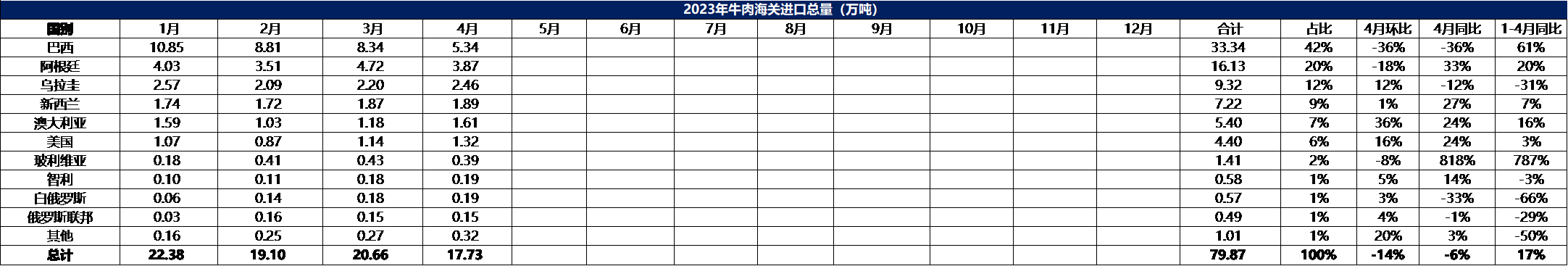 2023年4月中國(guó)主港牛肉進(jìn)口量17.73萬噸,同比減少6%,環(huán)比減少14%。1-4月累計(jì)主港牛肉進(jìn)口量79.87萬噸,同比增加17%。前五大進(jìn)口來源國(guó)仍為巴西、阿根廷、烏拉圭、新西蘭、澳大利亞。