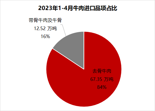 從進(jìn)口品項(xiàng)看,去骨牛肉進(jìn)口量67.35萬噸,占比84%,帶骨牛肉及牛骨進(jìn)口量12.52萬噸,占比34%。