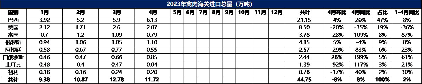 2023年4月冷凍禽肉進(jìn)口數(shù)據(jù)