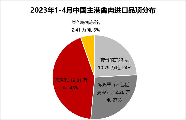 從進(jìn)口品項(xiàng)看,凍雞爪進(jìn)口量19.31萬噸,占比43%。凍雞翼(不包括翼尖)12.26萬噸,占比27%。