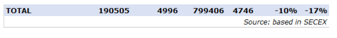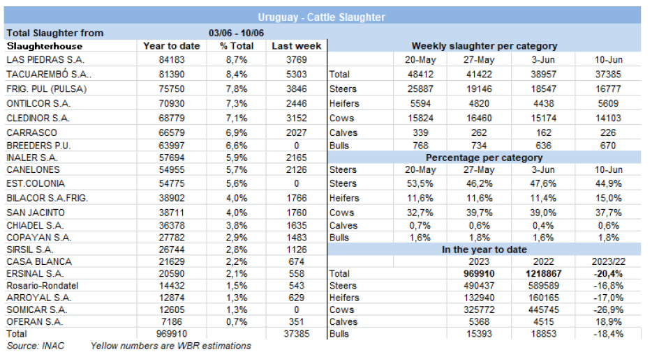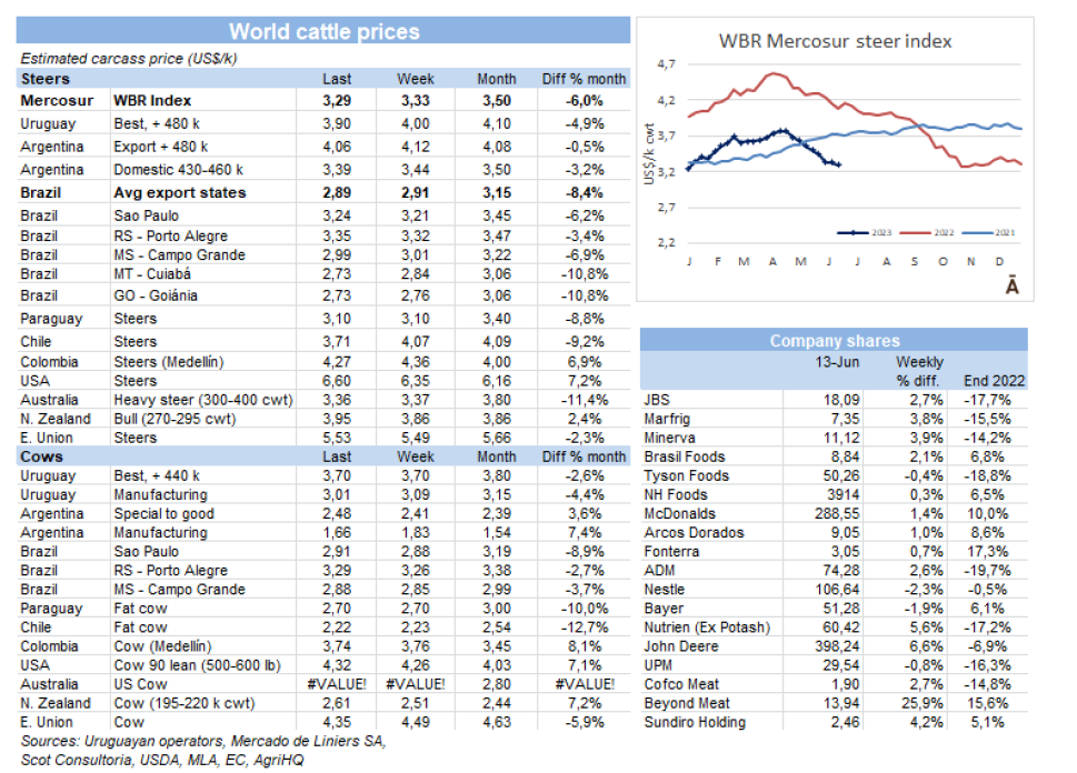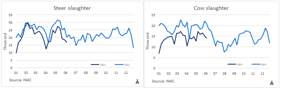 屠宰量前三的工廠是是12廠(5303頭)、7廠(3846頭)和379廠(3769頭)。Marfrig有三個(gè)比較活躍的工廠,共屠宰了10,620頭牛,而Minerva也有三個(gè)工廠,共屠宰了7999頭牛。到目前為止,6月份已經(jīng)屠宰了54,011頭牛,比2022年同期減少33%。