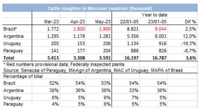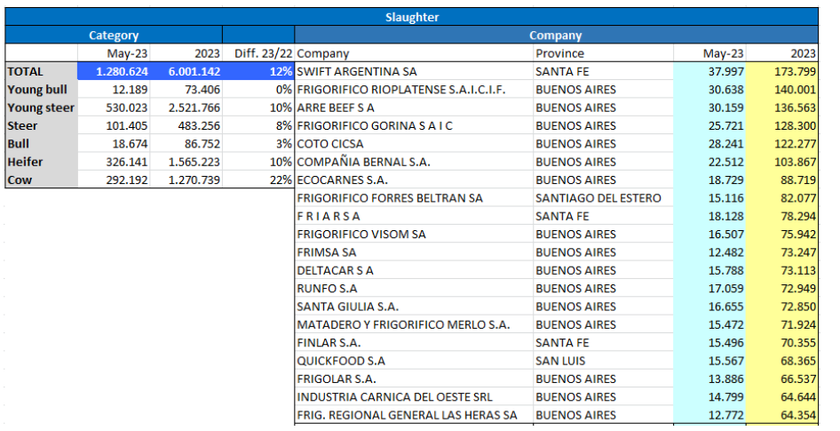 根據(jù)官方數(shù)據(jù)顯示5月份屠宰了128萬(wàn)頭牛,比上個(gè)月增長(zhǎng)了近9%,年度增長(zhǎng)率略高于10%。按工作日計(jì)算,5月份的屠宰量超過去年4月份總量的3%,比2022年5月的屠宰量高出16%。雖然在這兩方面的比較中都有增長(zhǎng),特別是同比增長(zhǎng),但與上個(gè)月相比有所下降,當(dāng)時(shí)日屠宰量在每月比較中增長(zhǎng)11%,同比增長(zhǎng)18%。在2023年的前五個(gè)月,牛的屠宰量超過了2022年同期。今年共有600萬(wàn)頭牛被屠宰,比去年同期多12%。