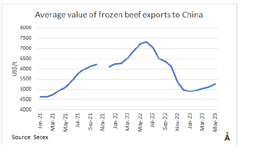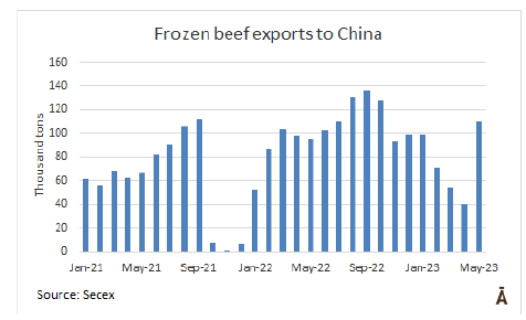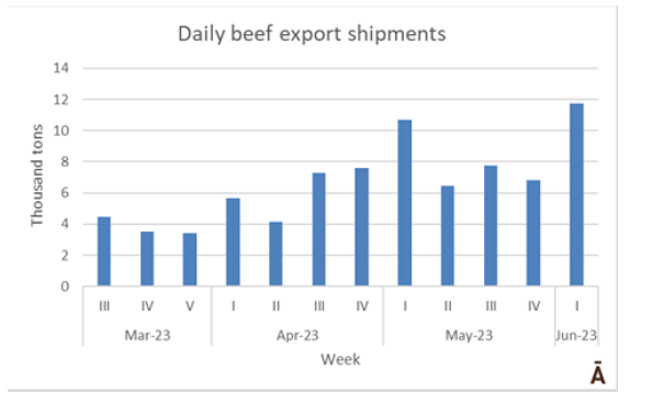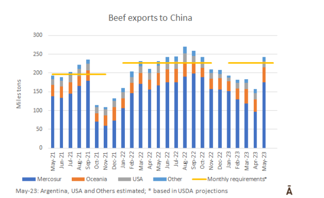 據(jù)估計(jì),5月份約有24萬(wàn)噸牛肉運(yùn)往中國(guó),這一數(shù)量將超過他們每月的需求量(估計(jì)為22.5-23萬(wàn)噸)。自去年10月以來,出貨量一直低于需求量。