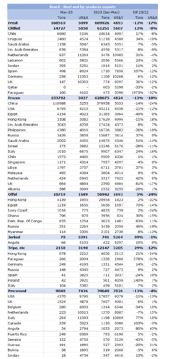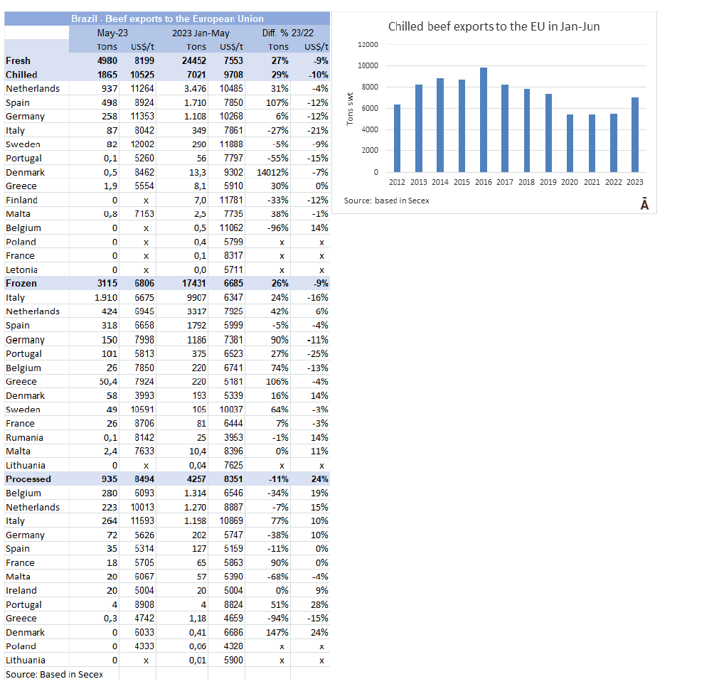 2023年以來巴西對(duì)歐盟的牛肉出口量大幅增加,這與國(guó)外總銷量的情況相反。在1-5月期間,巴西出口了24452噸鮮牛肉,比2022年同期多27%;冰鮮(增長(zhǎng)29%)和冷凍(增長(zhǎng)26%)的出口都有所增加。荷蘭在巴西鮮牛肉出口中占主導(dǎo)地位,其次是西班牙,而意大利在巴西冷凍牛肉出口中基本占主導(dǎo)地位,是總數(shù)量的57%。