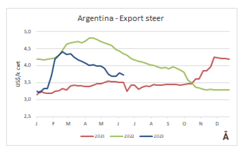 阿根廷由于貨幣貶值,出口閹牛的美元價(jià)格下跌$0.06至$4.06/公斤。