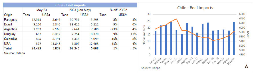 2023年前5個(gè)月智利進(jìn)口了97345噸,均價(jià)$5608/噸;數(shù)量同比下降5%,中值收縮3%。