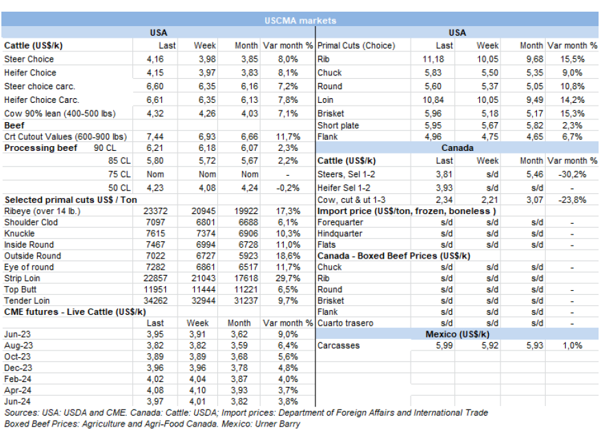 美國(guó)農(nóng)業(yè)部的數(shù)據(jù)報(bào)告顯示繼2022年上半年公布的出口總量之后,今年的出口量繼續(xù)下降。報(bào)告稱,4月份的牛肉和各種肉類出口量比去年低10%,總量為111,416噸,而產(chǎn)品價(jià)值下降18%,為8.595億美元。此外,在2023年前四個(gè)月,牛肉出口量下降8%,至437,910公噸,價(jià)值同比下降21%(32.1億美元)。