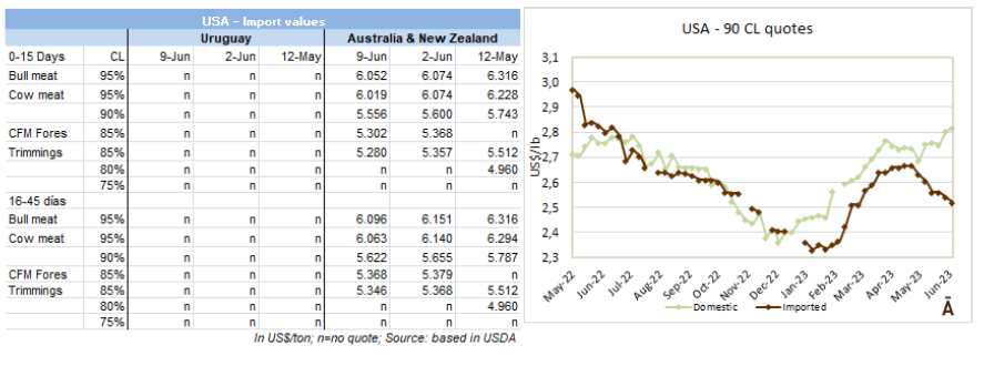 一位烏拉圭出口商說好消息是美國(guó)國(guó)內(nèi)的價(jià)格很高。壞消息是澳大利亞整極力向美國(guó)運(yùn)送超過其40萬(wàn)噸的免稅配額的出口量。鑒于中國(guó)幾周來市場(chǎng)表現(xiàn)出的疲軟狀態(tài),美國(guó)的市場(chǎng)越來越有優(yōu)勢(shì)。美國(guó)出的CFR參考價(jià)格為牛霖$5300-$5400,砧扒$5900,大米龍$5700。美國(guó)的出價(jià)要比中國(guó)的出價(jià)更有吸引力。而問題在于烏拉圭每年只有2萬(wàn)噸的免稅配額。美國(guó)出的CFR價(jià)95CL牛前(支付26.4%的關(guān)稅)$4300,90CL牛前$4000-$4100,85CL牛前$3950。這些出價(jià)也比中國(guó)高,盡管需求不是很大。消息人士說屠宰量低的情況下,美國(guó)的出價(jià)很有吸引力。