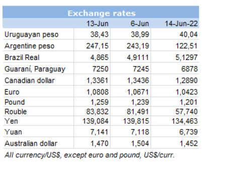 市場(chǎng)價(jià)格持續(xù)下跌。一位貿(mào)易商舉了一個(gè)例子,烏拉圭當(dāng)時(shí)以$5500的CFR價(jià)格出售,兩天后每噸下降了$500,而本周的出價(jià)是$4800。在付款時(shí)要格外小心,因?yàn)檫M(jìn)口商損失是巨大的,庫(kù)存的產(chǎn)品價(jià)值比目前的市場(chǎng)價(jià)要高得多。