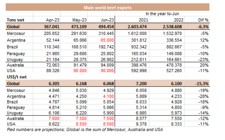 在2023年上半年,巴西出口了88.3萬(wàn)噸牛肉,平均價(jià)值為每噸4928美元,年出口量下降了5.3%,平均價(jià)值下降了18.3%。豬肉和雞肉的出口每年分別增長(zhǎng)15%和10%。