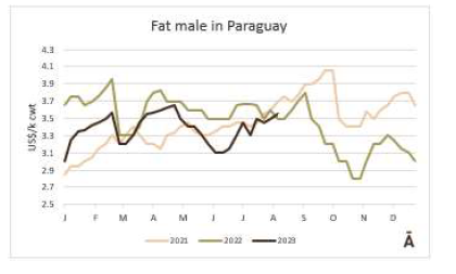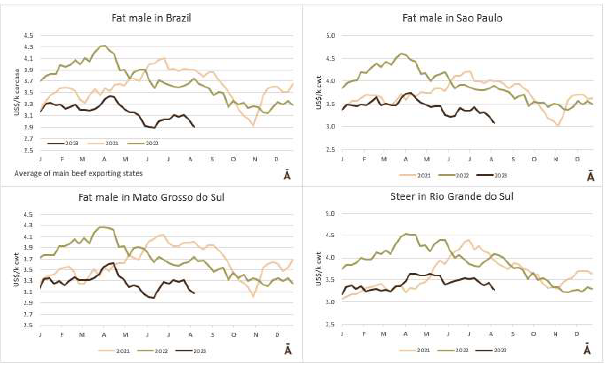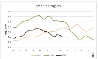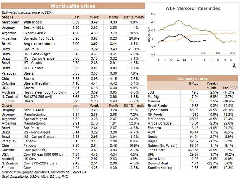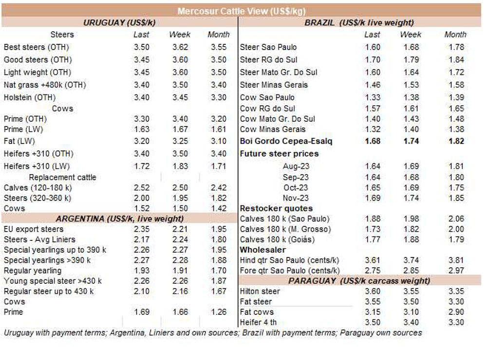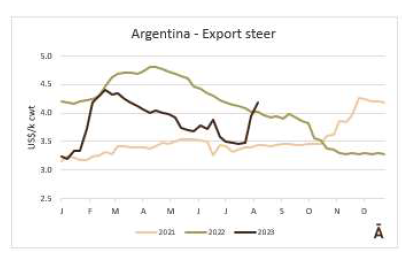 在阿根廷,價(jià)格繼續(xù)迅速上升。考慮官方匯率并增加9%的牛肉出口稅,本周出口公牛增加了26美分,上兩周增加了77美分,每公斤胴體重量為4.56美元。