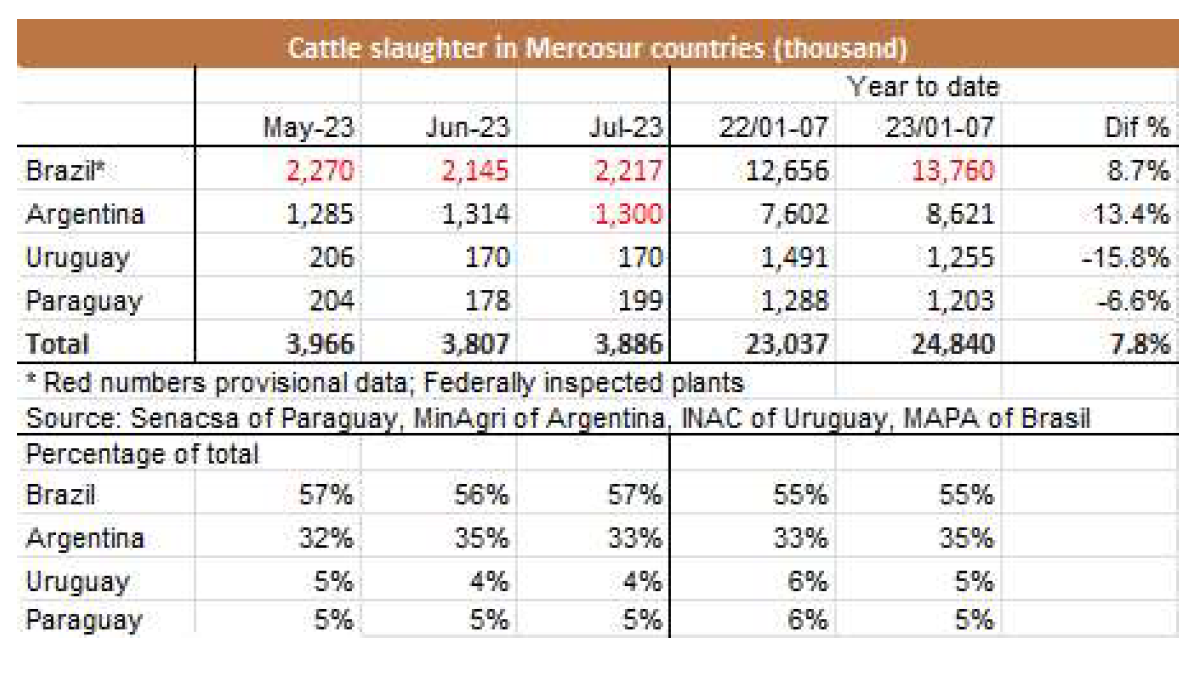 巴拉圭上半年的牛屠宰量月同比都低于2022年,下半年開始有所好轉(zhuǎn)。Senacsa報(bào)告稱,近19.9萬(wàn)頭牛進(jìn)入屠宰場(chǎng),比2022年7月多了近4000頭。良好的天氣和飼料條件可能會(huì)加快屠宰速度,因此下半年的屠宰動(dòng)態(tài)可能會(huì)高于2022年。最大的屠宰廠集團(tuán)Minerva,在四家屠宰廠加工了78544頭牛(占總數(shù)的39%),而管理三家屠宰廠的Concepcion集團(tuán)屠宰了61225頭牛(31%)。