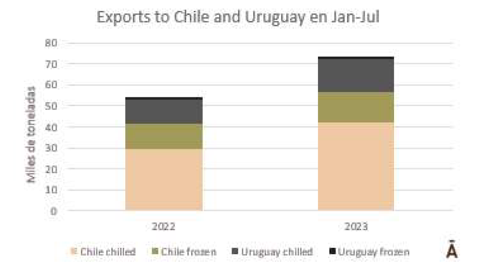 由于智利牛肉進(jìn)口牛價(jià)格的下降,巴西牛肉在國(guó)際市場(chǎng)上表現(xiàn)出競(jìng)爭(zhēng)力。根據(jù)Odepa的數(shù)據(jù),6月份,8903噸巴西牛肉抵達(dá)智利,這是今年迄今為止的最高月度產(chǎn)量,與巴拉圭的牛肉數(shù)量持平。來(lái)自哥倫比亞的牛肉量也大幅增加,達(dá)到1074噸,是過(guò)去至少兩年來(lái)的最高出口量。2023年上半年,智利進(jìn)口了59645噸牛肉,比2022年同期減少了8%。