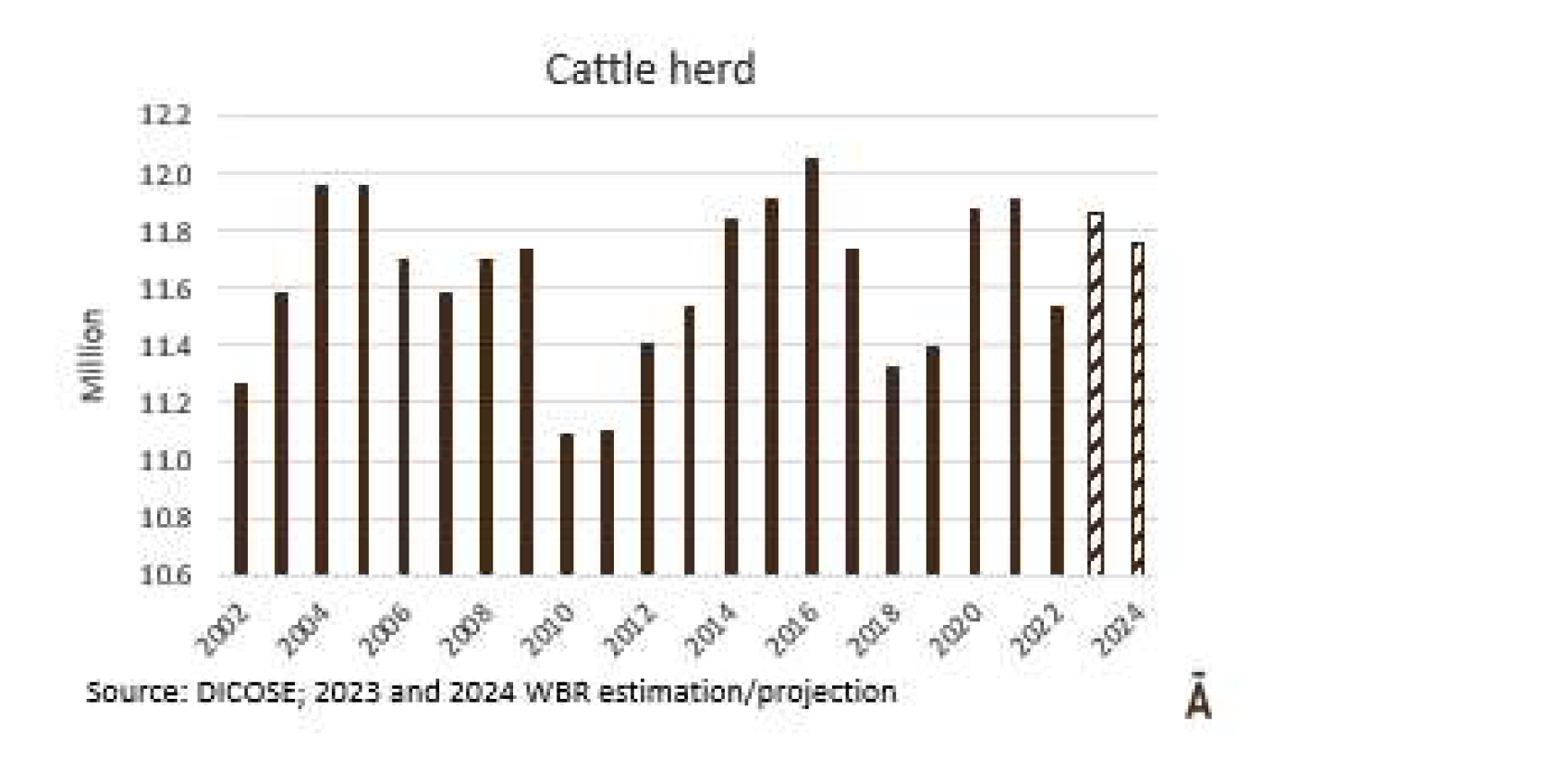 事實(shí)上,2022/23財(cái)政年度的牛庫(kù)存有所增加。畜牧部在9月份報(bào)告初步數(shù)據(jù)時(shí),顯示這個(gè)數(shù)字肯定會(huì)比去年多出30-35萬(wàn)只。當(dāng)畜牧部在9月份報(bào)告初步數(shù)據(jù)時(shí),這個(gè)數(shù)字肯定會(huì)比去年多出300-35萬(wàn)只。一方面,屠宰量急劇下降,從2021/22年度的274萬(wàn)頭下降到215萬(wàn),減少了57萬(wàn)頭牛??偟膩?lái)說(shuō),鑒于2022年下半年活牛產(chǎn)量幾乎為零,除上半年增長(zhǎng)外,兩年的活牛出口略有收縮。除此之外,還有對(duì)良好產(chǎn)仔和斷奶的預(yù)期。根據(jù)INIA妊娠研討會(huì)的數(shù)據(jù),2022年的妊娠率達(dá)到了80%。因此,隨著懷孕和斷奶的時(shí)間減少,6月30日統(tǒng)計(jì)的小牛數(shù)量幾乎肯定超過(guò)了290萬(wàn)頭??紤]到出欄和小牛的進(jìn)入,牛群將增加約30-35萬(wàn)頭達(dá)到約1186萬(wàn)頭的數(shù)量。2023/24財(cái)政年,受干旱的影響,牛群數(shù)量很可能會(huì)減少。今年的INIA妊娠研討會(huì)報(bào)告稱,與前一年相比,妊娠率下降了9個(gè)百分點(diǎn),因此斷奶率將略高于60%。明年6月30日的小牛數(shù)量肯定會(huì)減少約30萬(wàn)達(dá)到260萬(wàn)頭。2023/24年初的國(guó)際市場(chǎng)狀況和對(duì)中國(guó)經(jīng)濟(jì)發(fā)展的預(yù)期不容樂(lè)觀,因?yàn)閺?qiáng)烈的購(gòu)買壓力將加快屠宰速度,因此屠宰量可能會(huì)接近200萬(wàn)頭牛,2023/24財(cái)政年度末的牛群數(shù)量可能會(huì)減少約10萬(wàn)頭。