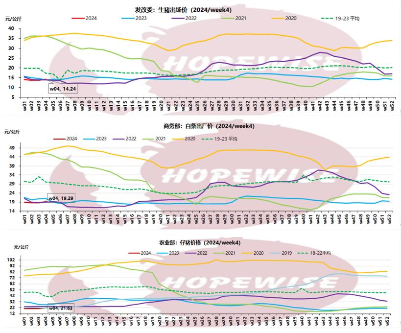 2024 年第 4 周活豬價格為 14.24 元/公斤,與上周相比上漲 3.9%,但與去年同期相比下跌 7.59%。胴體價格為 19.29 元/公斤,與上周相比上漲 4.3%,但與去年同期相比下跌 8.7%。受新一輪雨雪天氣影響,南方市場的運輸受到一定阻礙。本周初,全國豬肉價格上漲超過 14.5 元/公斤。然而,豬價上漲后,終端客戶的后續(xù)需求疲軟。市場對未來上漲的預(yù)期減弱,導(dǎo)致養(yǎng)豬積極性下降。臨近周末,豬肉價格再次出現(xiàn)窄幅調(diào)整。