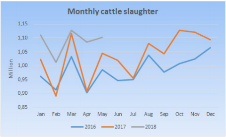 澳洲天氣干旱活牛供應(yīng)增加,導(dǎo)致五月出口量大增,五月總出口109700噸,歷史上只有2015年五月由于干旱原因出口量更高。五月出口量比四月高了21500噸,即24%,比去年五月高15%。五月總共屠宰58萬頭,比去年同期增長10%,一至五月總屠宰269萬頭,比17年增加8%。出口到亞洲的牛肉總量創(chuàng)下了月度紀錄,比之前最高峰高了10%,亞洲國家比如印尼,南韓,日本和中國需求都增長不少,一至五月出口日本125700噸,同比增長12%,出口美國91700噸,同比增長4%,出口韓國61700噸,同比增長15%,出口中國59400噸,同比增長40%。