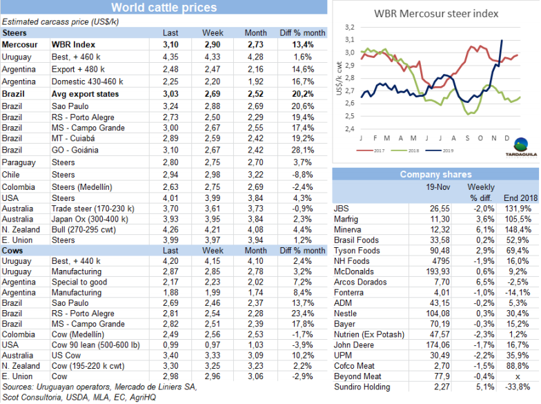 受巴西價(jià)格強(qiáng)勢(shì)增長(zhǎng)影響,南方共同市場(chǎng)閹牛平均價(jià)格強(qiáng)勢(shì)增長(zhǎng),南方市場(chǎng)閹牛價(jià)格指數(shù)本周上漲20美分,上漲至至3.1美元/公斤,達(dá)到自2016年10月三年多以來(lái)最高水平。巴西直接出口中國(guó)的工廠增加,需求端對(duì)相對(duì)短缺的供應(yīng)端做出反應(yīng),本周價(jià)格按雷亞爾計(jì)算增長(zhǎng)了13%,按美元計(jì)算增長(zhǎng)了12.4%,主要的出口州老公牛平均胴體價(jià)格3.03美元/公斤,一周內(nèi)增長(zhǎng)了34美分。阿根廷情況則不同,出口閹牛價(jià)格仍然保持10月末的水平,歐洲需求的減少對(duì)價(jià)格有一定影響。巴拉圭市場(chǎng)更加穩(wěn)定,胴體價(jià)格2.8美元/公斤,達(dá)到3月初至今最高。烏拉圭特種閹牛價(jià)格達(dá)歷史最高,胴體價(jià)格4.35美元/公斤,在接下來(lái)的幾天價(jià)格會(huì)趨于平緩。