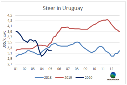 由于歐洲市場(chǎng)需求受新冠肺炎疫情影響,4月烏拉圭至歐盟國家牛肉出口量達(dá)歷史最低,冰鮮牛肉出口量下降更加明顯。根據(jù)海關(guān)發(fā)布數(shù)據(jù),4月烏拉圭出口至歐盟國家冰鮮牛肉265噸,冷凍牛肉415噸,冰鮮牛肉出口量只有481配額季度開始月份(即該季度銷量最低的月份)銷量的三分之一。今年前四個(gè)月烏拉圭至歐盟國家出口冰鮮牛肉共6046噸,平均出口價(jià)格9815美元/噸,年度對(duì)比中出口量減少了23%,平均出口價(jià)個(gè)上漲了4%,近幾周價(jià)格的大幅下跌將把平均價(jià)格的差異增長(zhǎng)拉低至負(fù)數(shù)。