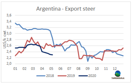 雖然在隔離令開始時(shí),阿根廷國內(nèi)市場(chǎng)的牛肉消費(fèi)出現(xiàn)反彈,但隨著實(shí)行社會(huì)補(bǔ)貼,最初的熱情逐漸消退。一位市場(chǎng)專家指出,這些天來,恐慌累積導(dǎo)致許多產(chǎn)品的需求下降,原因是家庭預(yù)算問題,信用卡的使用時(shí)間縮短到月底。牛肉是受到影響的一種商品,價(jià)格與國外市場(chǎng)相比很低,本地也沒有其他的食物的競(jìng)爭(zhēng),這反映出供應(yīng)多而價(jià)格下跌。此外閹牛的需求端出現(xiàn)問題,國內(nèi)需求僅能消費(fèi)牛肉產(chǎn)量的四分之三。