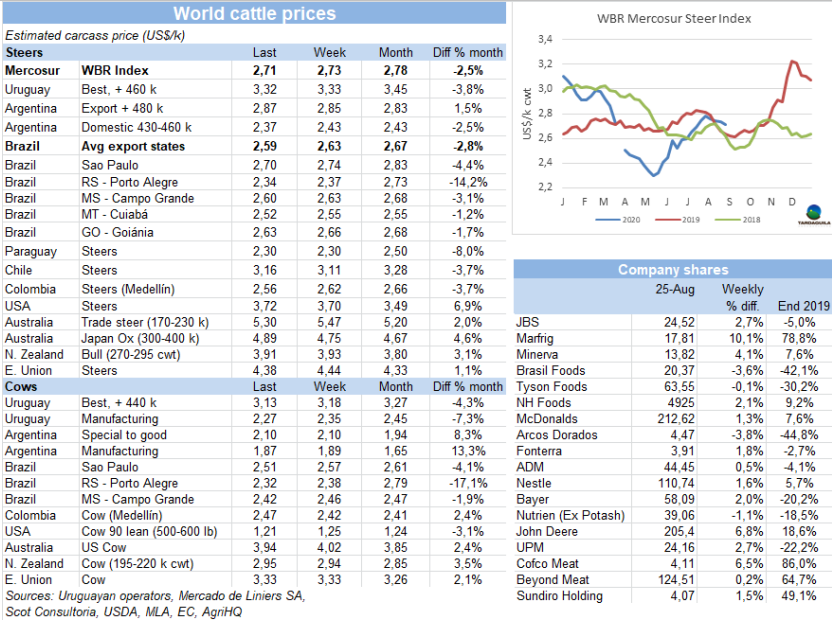 本周巴西雷亞爾貶值2.6%,因此盡管巴西待宰牛價(jià)格保持堅(jiān)挺,甚至上漲,美金育成牛牛價(jià)仍下跌4美分,下跌至2.59美元/公斤。這是本周南方共同市場(chǎng)閹牛價(jià)格指數(shù)下跌2美分至2.71美元/公斤的主要原因。其他地區(qū)牛價(jià)保持穩(wěn)定,阿根廷有輕微漲幅,烏拉圭牛價(jià)下跌。