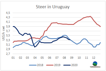 截止8月20日的一周,在屠宰量和各牛種的分布上屠宰量水平與前一周相當(dāng)。烏拉圭肉協(xié)報(bào)告,上周合規(guī)屠宰場(chǎng)活牛屠宰量38527頭,較上周增長(zhǎng)了65頭,同比去年同期的屠宰量4.3萬頭下降了10%。屠宰場(chǎng)繼續(xù)481配額的屠宰,這也反應(yīng)了屠宰的構(gòu)成,與上周相同,其中閹牛屠宰量21478頭,占55.7%,小母牛屠宰量7335頭,占19%,母牛屠宰量9262頭,占24%。屠宰量最高的工廠是Marfrig-Tacuarembo(4596頭),Las Piedras(4339頭),NH-BPU(3976頭)。Marfrig三家工廠屠宰總量11023頭,較前一周增長(zhǎng)了10874頭。八月截止22日屠宰量114992頭,同比下降了9.3%,八月屠宰量預(yù)計(jì)在15萬頭多一些,與2019年八月17.8萬頭相差較遠(yuǎn)。