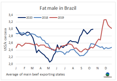 屠宰工廠為出口中國準(zhǔn)備的牛的活牛支付高價的階段已經(jīng)基本過去了,能滿足春節(jié)需求的船期大多數(shù)都在十一月中旬,很明顯很多出口商已經(jīng)完成銷售。圣保羅育成牛成交價261-265雷亞爾/15公斤,較上周上漲了3雷亞爾/15公斤。本周初市場較為平靜,可能是由于預(yù)期國內(nèi)需求將在本月下半月趨于平靜。盡管大部分地區(qū)牛家有所上漲,但米內(nèi)羅三角和戈亞尼亞等地區(qū)的牛價上周沒有發(fā)生變化。