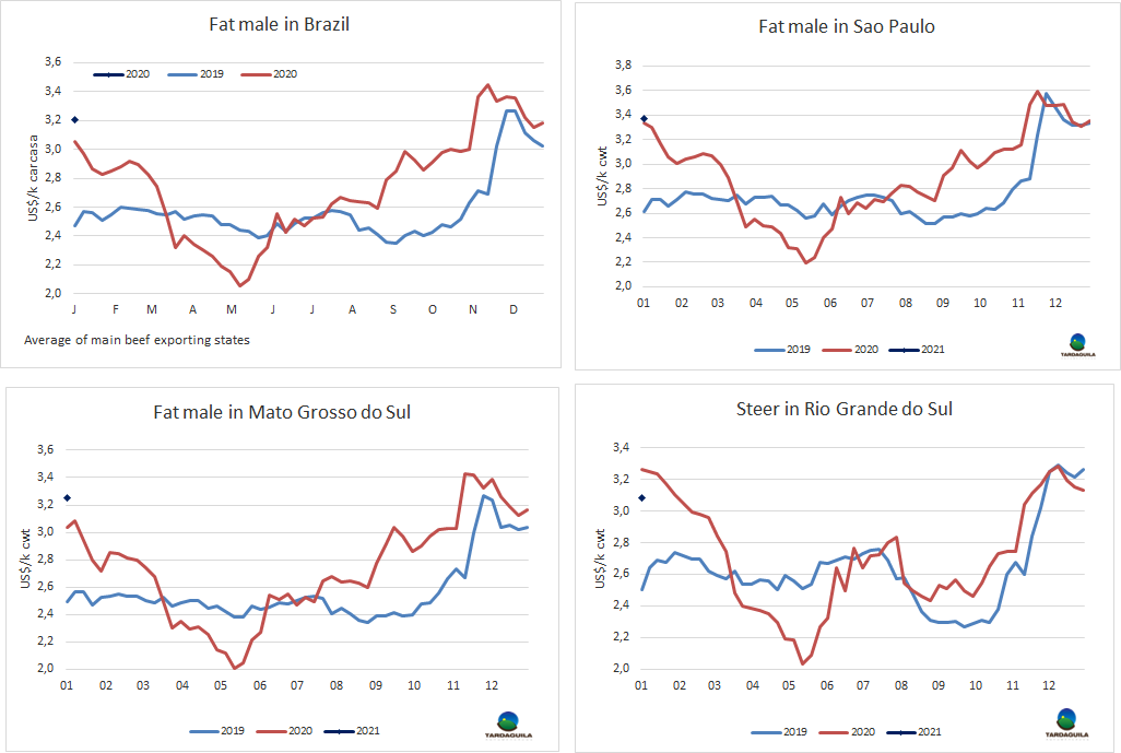 巴西育成牛價(jià)格的下行修正階段很短,2021年第一周,活牛價(jià)格開(kāi)始回漲,盡管較11月價(jià)格高點(diǎn)仍有差距,昨天圣保羅活牛成交價(jià)266雷亞爾/15公斤,30天付款(適合與出口市場(chǎng)的低齡活牛成交價(jià)高出7雷亞爾)。較上周增長(zhǎng)了10雷亞爾/15公斤。市場(chǎng)成交有限,供應(yīng)偏緊。批發(fā)市場(chǎng)后部位肉價(jià)格回漲,昨天參考價(jià)21.1雷亞爾/公斤較上周上漲了40美分,前部位肉價(jià)仍保持穩(wěn)定,14.4雷亞爾/公斤。
