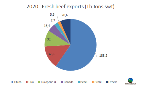 2020年烏拉圭牛肉出口量31.6萬(wàn)噸,較2019年減少了1萬(wàn)噸,較2018年最高出口量減少了1.3萬(wàn)噸,平均出口價(jià)格5105美元/噸,同比下降了7%。對(duì)中國(guó)出口量18.8萬(wàn)噸,占總出口量的60%,其中包括74.6萬(wàn)噸牛副(約占85%)。牛肉的第二出口目的地是美國(guó),對(duì)美國(guó)出口量4.6萬(wàn)噸,占總出口量的14%,第三是歐盟,對(duì)歐盟出口量3.2萬(wàn)噸,占總出口量的10%。其次是加拿大(1.64萬(wàn)噸)、以色列(7.7萬(wàn)噸)和巴西(5.5萬(wàn)噸)。