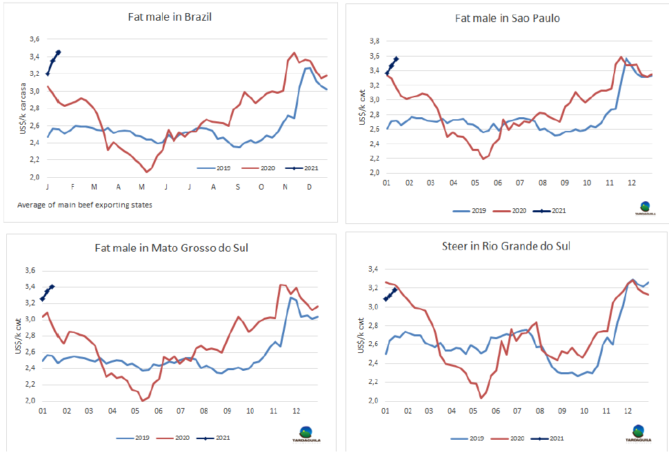巴西方面對(duì)中東和香港市場(chǎng)的貿(mào)易基本停滯了。由于活牛價(jià)格上漲,出口商成本上漲,貿(mào)易變得更加困難。中東和香港市場(chǎng)陷入停滯一名巴西貿(mào)易商表示,“什么都沒(méi)有賣”,而巴西國(guó)內(nèi)市場(chǎng)上行也會(huì)對(duì)此產(chǎn)生影響。