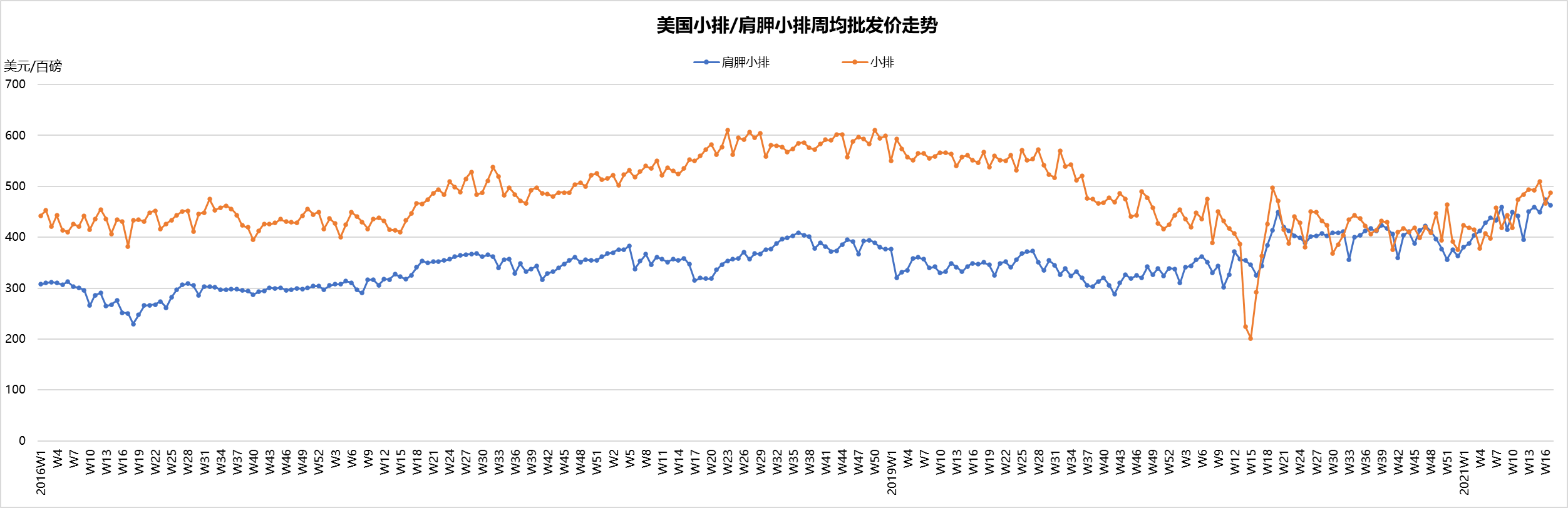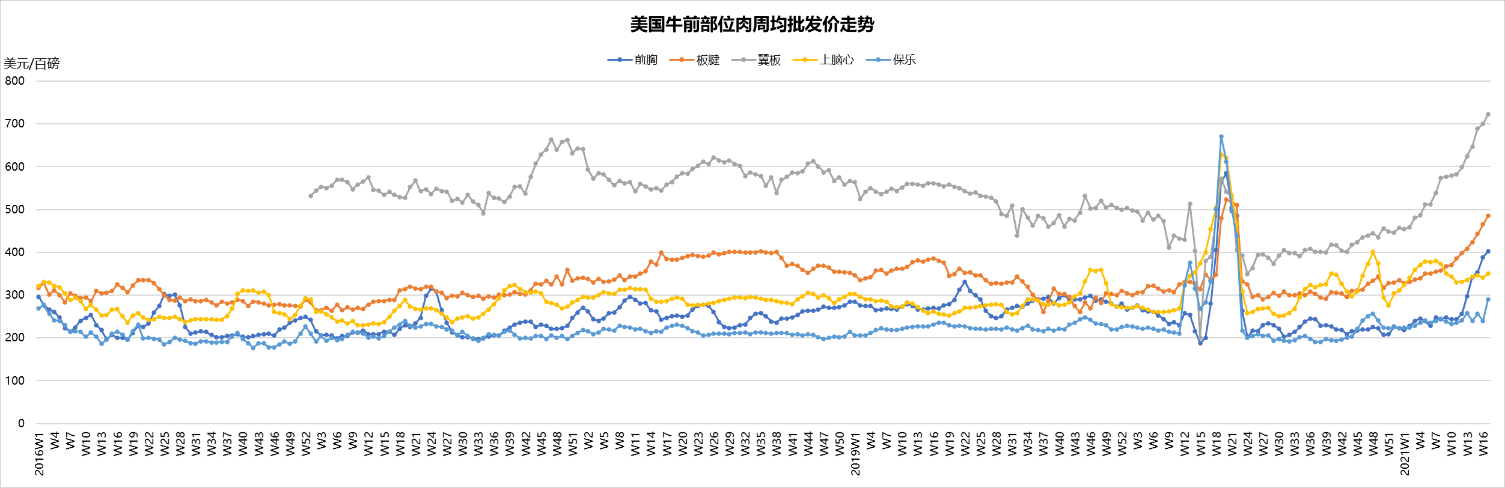 4月部位肉批發(fā)價保持堅挺,精選級部位肉綜合價2.8美元/磅,較上周增長了2.5%,較去年同期上漲了2.9%。去年受疫情影響部位肉批發(fā)價急劇上漲。餐飲的復(fù)蘇是最近部位肉價格上漲的主要原因。
