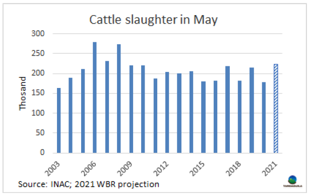 上周牛屠宰量再次增長,烏拉圭肉協(xié)報告統(tǒng)計,上周屠宰量55712頭,較前一周增長了2000多頭,達今年周屠宰量的第二高。較去年同期增長了超過10000頭。隨著歐洲481配額的生產(chǎn)全面打開,閹牛屠宰量達29938頭,達20183月第三周至今三年多以來最大,同樣,小母牛屠宰量達6263頭,達3月第一周以來最大。相反,母牛屠宰量下降至18598頭,較上周下降了2432頭。屠宰量最大的工廠是Athena-Pulsa4956頭),Las piedras4532頭),Athena-Canelones4476頭)。本周Athena三家工廠屠宰總量13639頭,Marfrig四家工廠屠宰總量13772頭,日資企業(yè)BPU上周五進行了最后一次屠宰活動,本周暫未開始屠宰,還在等待中國市場的重新準入。截止522日,牛屠宰量達160548頭,較2020年同期增加了15575頭,約增長了20%。如果不出現(xiàn)疫情相關的重大問題,五月屠宰量將超過22萬頭,達10年以來最高。 5月也將成為連續(xù)第八個屠宰量高于去年同期的月份。