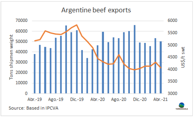 阿根廷政府為控制國內(nèi)肉類價格的上漲實行了30天的出口禁令,該禁令排除對該國有關稅配額的出口活動,如希爾頓配額,481配額,美國配額和哥倫比亞配額。對以色列冰鮮產(chǎn)品的出口是否可以排除在外還不能確定。希爾頓配額和481配額代表著絕大多數(shù)牛肉對歐盟的出口量。2021年前四個月,阿根廷對歐洲冰鮮牛肉出口量達10187噸,出口額達9010萬美元,481配額出口量1540噸。同一時期阿根廷對美國出口量4427噸,占配額總量的22.7%,出口額2660萬美元。哥倫比亞的配額目前關聯(lián)不大。因此,被排除的出口量占總出口量的7.4%,由于這些產(chǎn)品的成交價格很高,按美元計的占比可能更高。除中國市場外,受出口暫停政策影響的市場主要是以色列、智利和巴西。除這些市場之外,目前正在進行的發(fā)貨包括上周一(正式知道禁令的那一天)之前簽訂的所有銷售訂單,以及在聲明和該措施生效(周四公布第75號決議)之間登記的銷售訂單。在此期間,許多出口商仍在繼續(xù)進行牛肉出口。