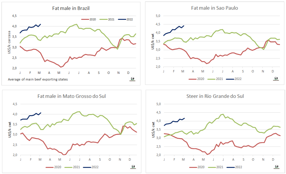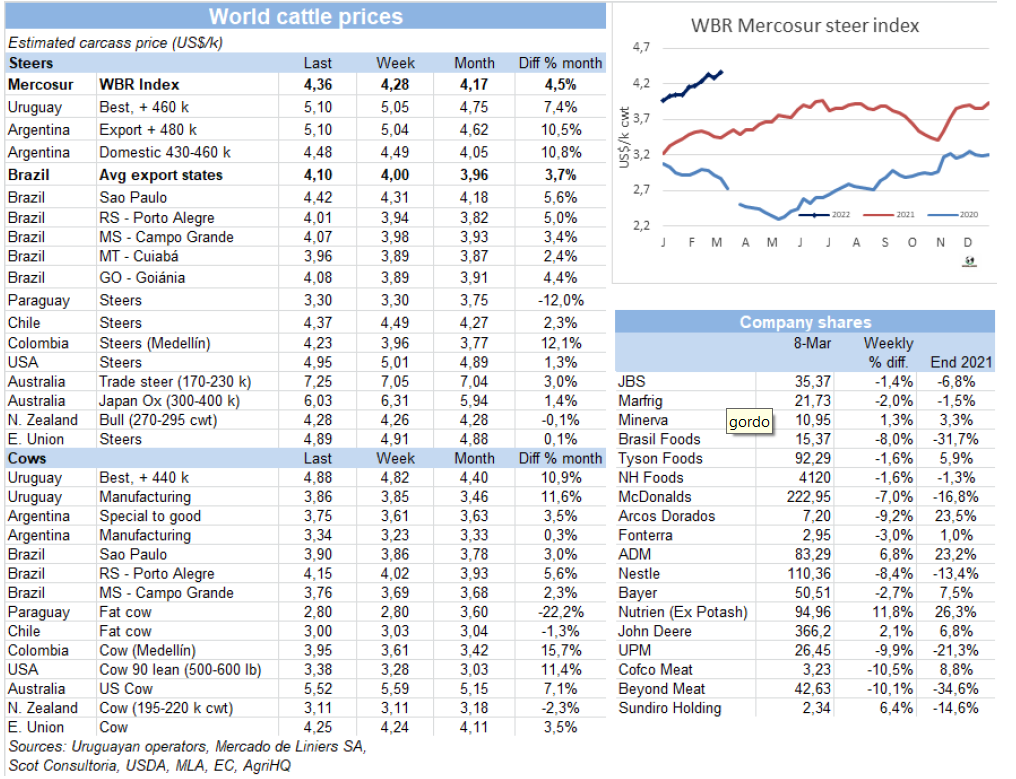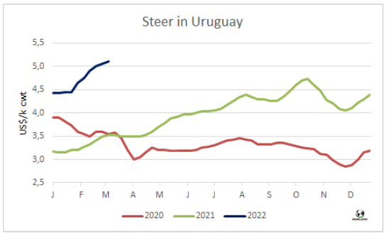 本周南方共同市場閹牛價(jià)格指數(shù)繼續(xù)8美分至4.36美元/公斤,創(chuàng)新紀(jì)錄。巴西烏拉圭阿根廷牛價(jià)均上漲,巴西育肥牛平均價(jià)格上漲主要原因是匯率走強(qiáng)和本地雷亞爾價(jià)格同步上漲,美金牛價(jià)較上周上漲了10美分至4.1美元/公斤。阿根廷和烏拉圭牛價(jià)達(dá)南美地區(qū)最高,也是歷史最高價(jià)格,本周出口閹牛參考價(jià)接近5.1美元/公斤,巴拉圭方面牛價(jià)趨勢相反,西方對(duì)俄羅斯的制裁限制了向這個(gè)國家銷售的可能性,巴拉圭受到了強(qiáng)烈的沖擊。