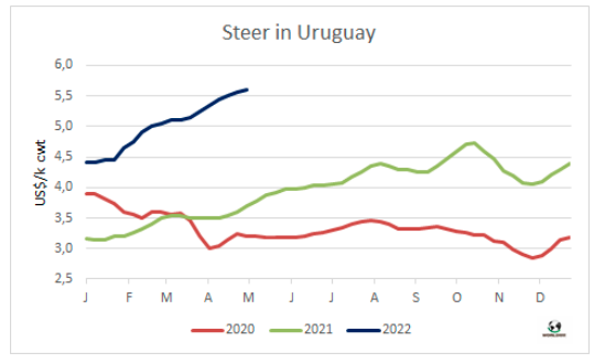 四月烏拉圭牛肉出口量34175噸,平均出口價(jià)格飆升至7370美元/噸,較上月增長了8%,創(chuàng)新紀(jì)錄。對(duì)中國出口牛肉的平均價(jià)格保持強(qiáng)勁上漲趨勢,基于出口請(qǐng)求的海關(guān)數(shù)據(jù)顯示對(duì)中國出口帶骨牛肉4992噸,去骨牛肉18483噸,去骨牛肉平均出口價(jià)格6887美元/噸,環(huán)比增長了5.2%,同比增長了36%。帶骨牛肉平均出口價(jià)格4683美元/噸,環(huán)比增長了1%。中國占四月烏拉圭牛肉出口量的 76%,30948噸中的23475噸出口到中國市場,第二大主要市場是美國(3856噸),其次是巴西(581噸)。今年第一季度烏拉圭冷凍牛肉出口量126492噸,冰鮮牛肉出口量13696噸,同比增長了19%,冷凍牛肉出口的平均離岸價(jià)格同比增長了33%,達(dá)6418美元/噸,冰鮮牛肉出口平均離岸價(jià)格增長了28%至10784美元/噸。