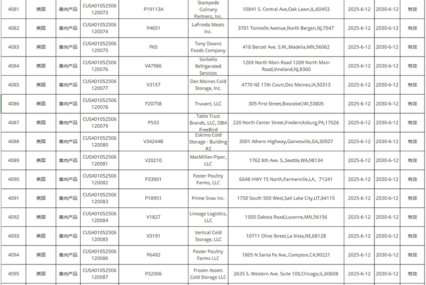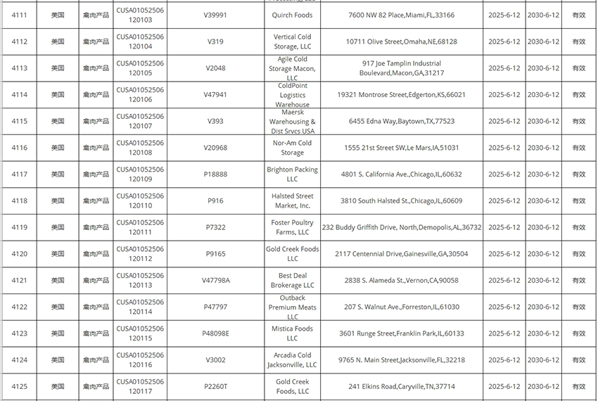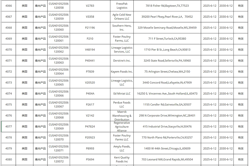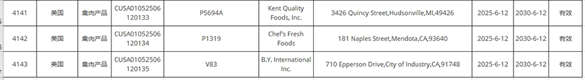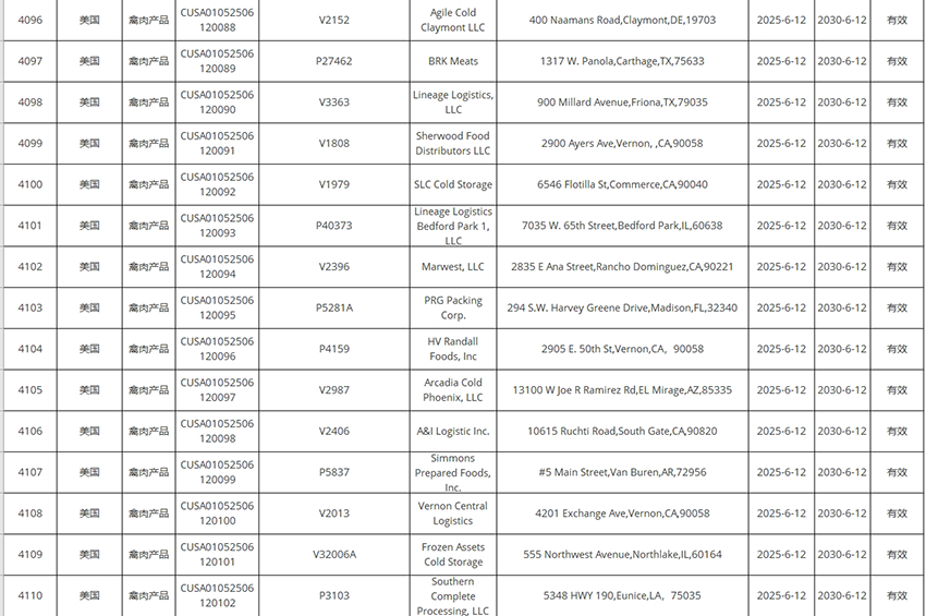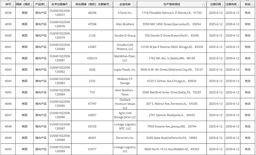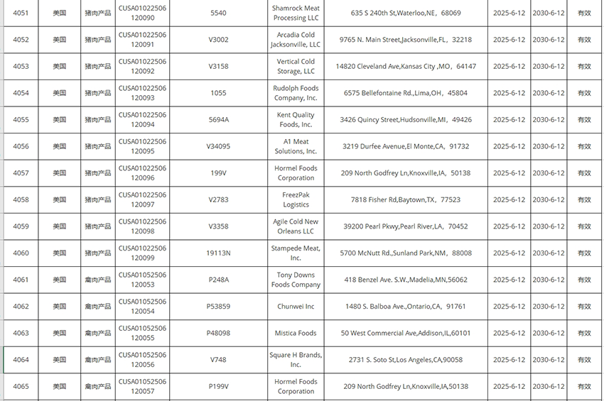 新增美國豬肉、禽肉企業(yè)自2025年6月12日及之后生產(chǎn)的符合中國要求的肉類產(chǎn)品輸華。其中83家禽肉企業(yè),23家豬肉企業(yè)。