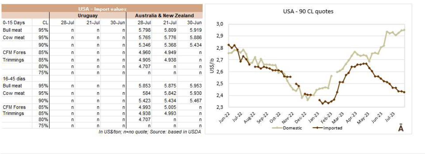 一位貿(mào)易商表示,在大洋洲(新西蘭和澳大利亞)大量牛肉供應(yīng)占主導(dǎo)地位的情況下,美國進(jìn)口市場并沒有表現(xiàn)出很大的變化。烏拉圭配額內(nèi)牛前部位肉90CL的參考價格為FOB 4550美元每噸。